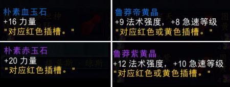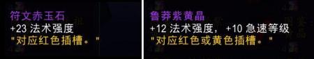 值得注意的是法伤石头,红色+23法伤,但是混色的是+12法伤,也就是说使用两个橙色宝石会比使用一个红色+一个黄色的收益高1法伤。法系在插石头的时候要稍微留心一下。